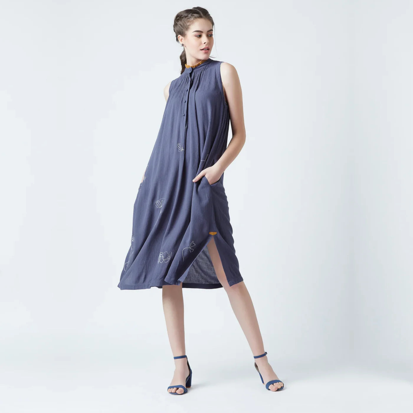 Neck gathered tunic in purple with ruffled mustard collar and inseam pockets. The subtle styling of the piece makes for a great dress or tunic style.