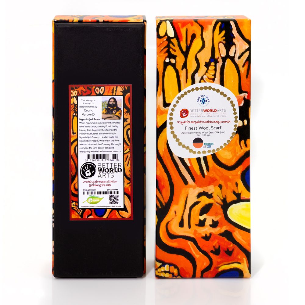 This wool scarf celebrates the Dreamtime story of Ngurunderi and the creation of the Murray River, Lakes, and Coorong in Ngarrindjeri Country. Featuring bold, flowing artwork developed through a collaborative workshop with Better World Arts, the design captures the vibrant colours and passionate energy of artist Cedric's evolving style. Woven from quality wool, this piece honours the ancient lore, dance, and songs that sustain the Ngarrindjeri People, bringing cultural narrative and artistic excellence to your everyday wear.